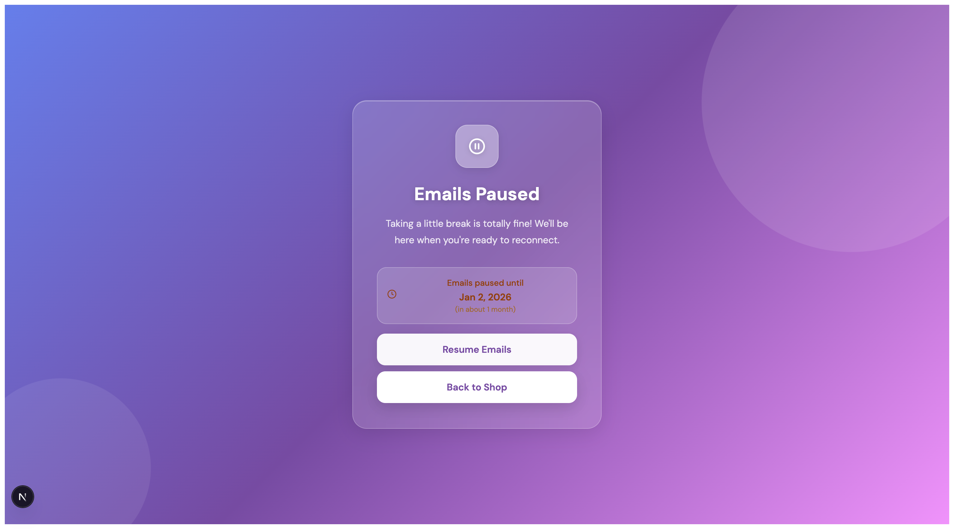 When a subscriber chooses to pause emails, they see a confirmation page:
