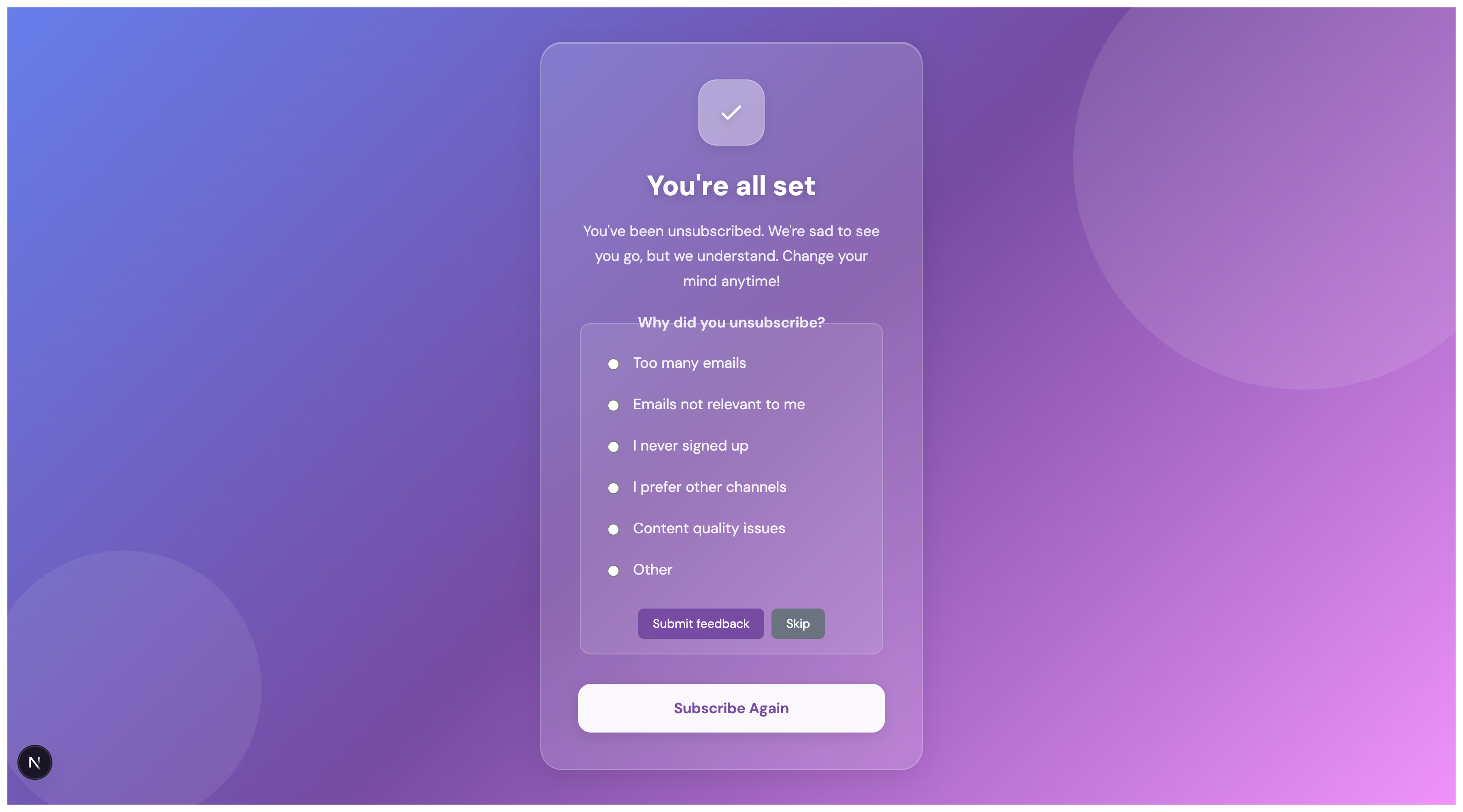Even after unsubscribing, subscribers can immediately resubscribe using the "Subscribe Again" button, making it easy for them to change their mind.